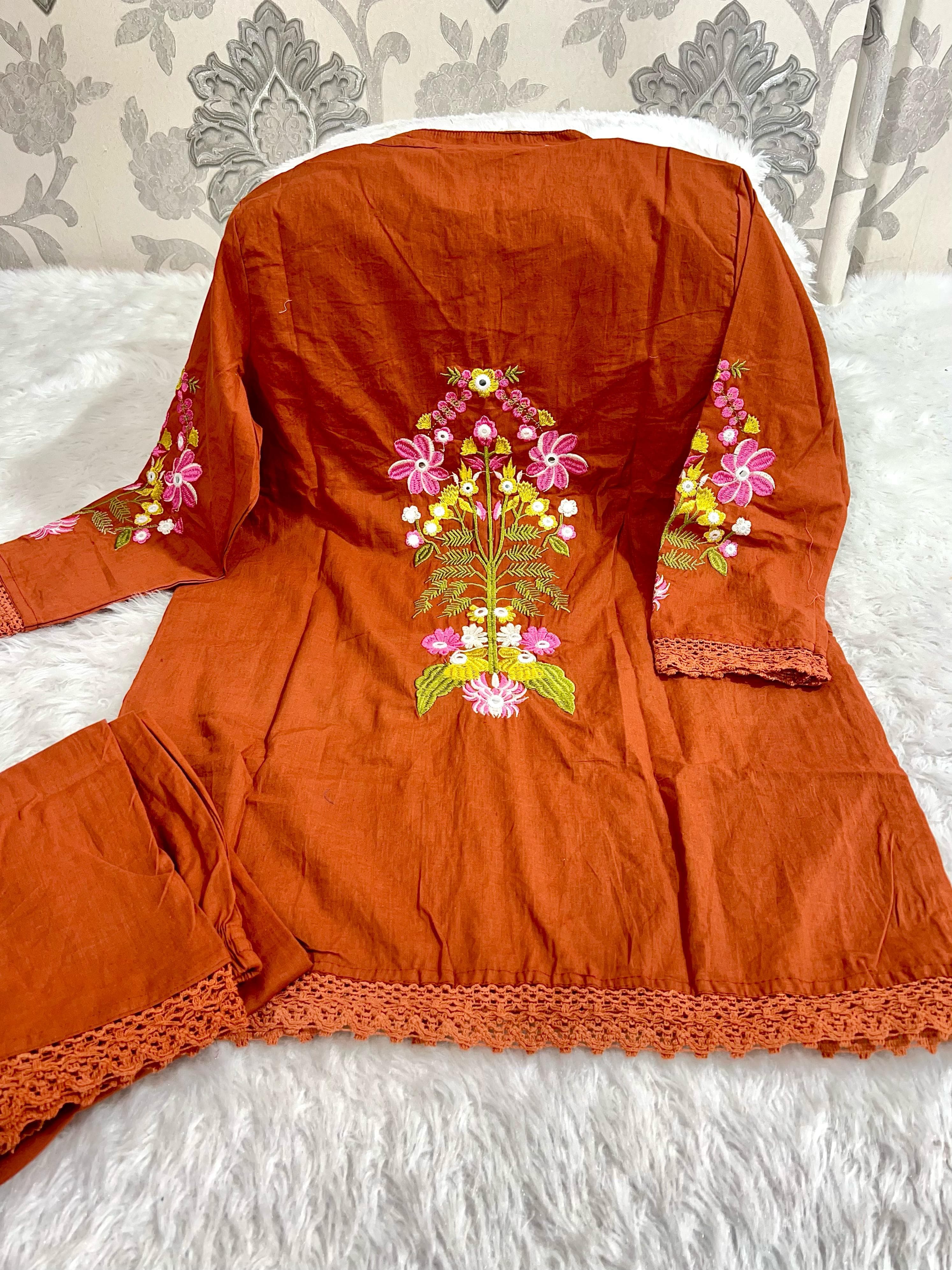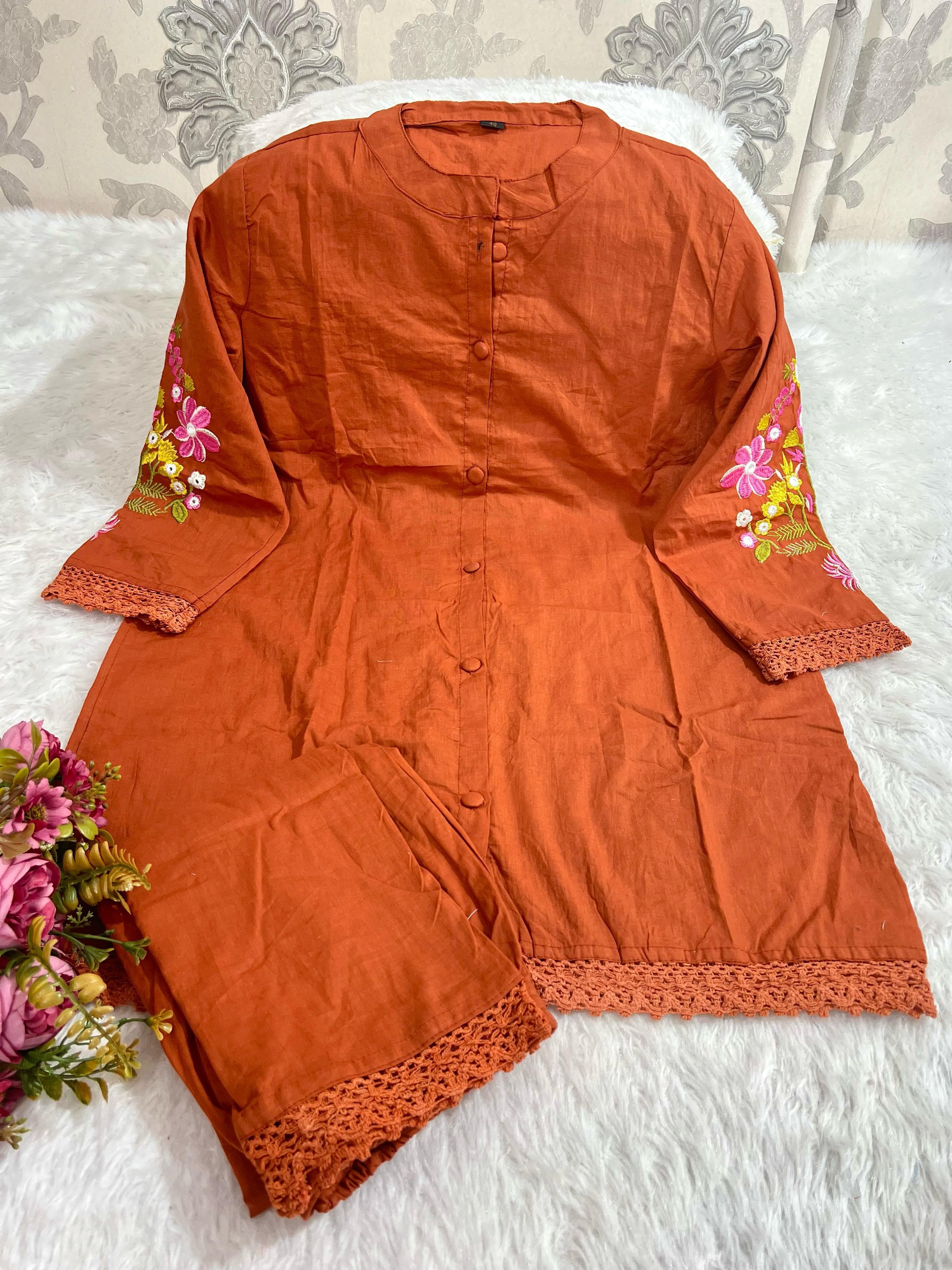 JKWH 997 Pure Fine Cotton Febric Embroidery Work A-line Kurti Set With Pocket